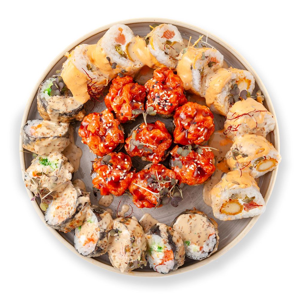 2.Темпура Ролл с тар-таром лосося,огурцом,авокадо,икрой летучей рыбы,соусом спайси и соусом терияки.
