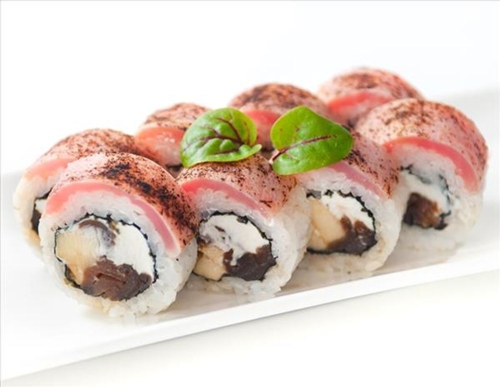 Рис, нори, сливочный сыр, сухой яичный белок, тыква маринованная, яблоко, тунец опаленный. Производитель: ООО "Фьюжн суши"