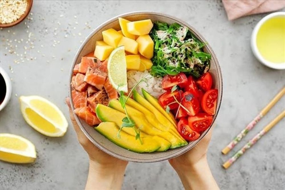 Рис, лосось опаленный, манго, морские водоросли, авокадо, томаты Черри, кунжут, соус Кахуту Производитель: ООО "Фьюжн суши"